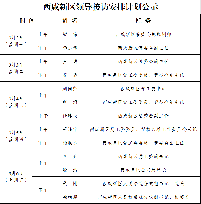 西咸新区领导接访安排计划公示(3月2日-6日)