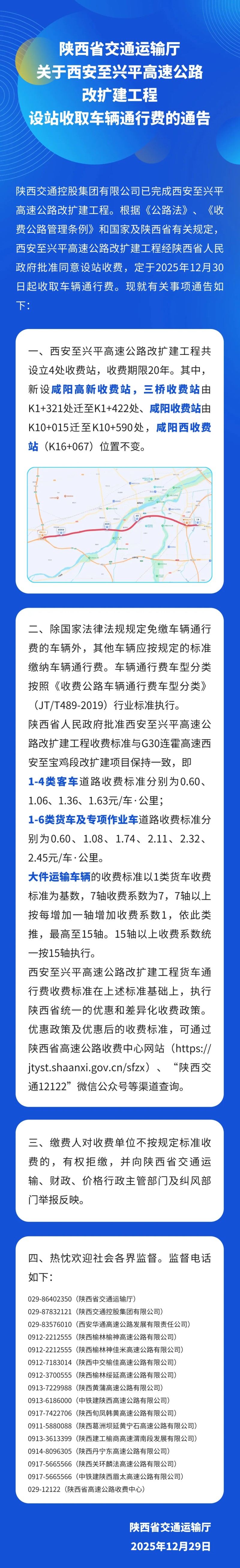 12月29日,陕西省交通运输厅发布关于西安至兴平高速公路改扩建工程设站收取车辆通行费的通告,具体内容如下。